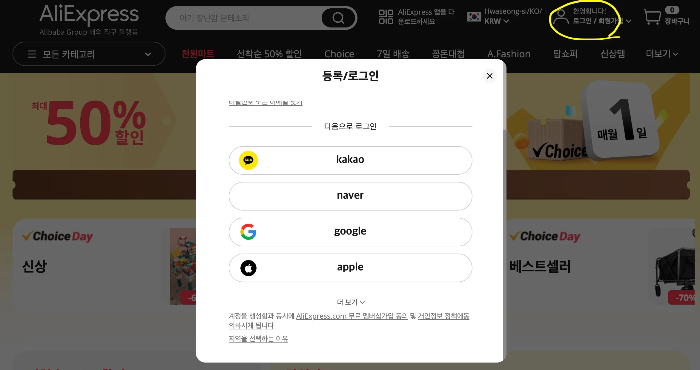 다양한 방법으로 로그인이 가능한 알리익스프레스 (많이 편해졌네)