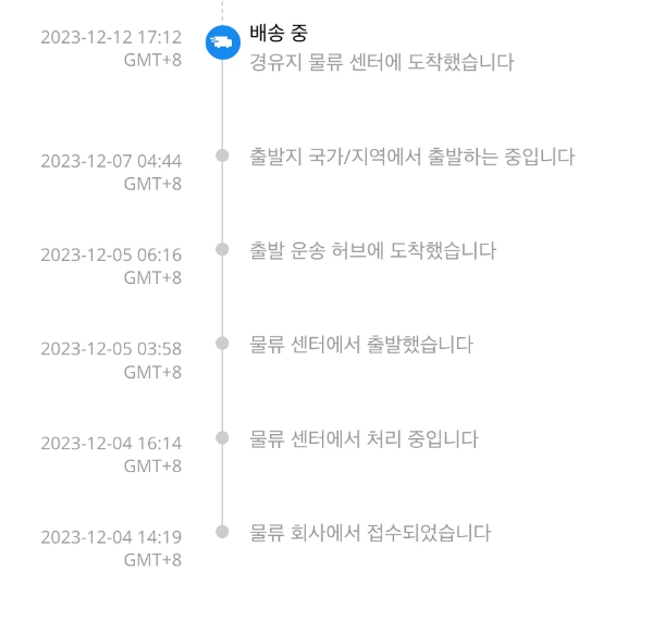 알리에서 배송현황을 조회할 때는 출발국가와 도착국가(한국)를 구분해서 보는 것이 좋다. 아래 사진의 '경유지 물류 센터에 도착했습니다'는 출발국가에서의 마지막 배송 절차라고 보면 된다.