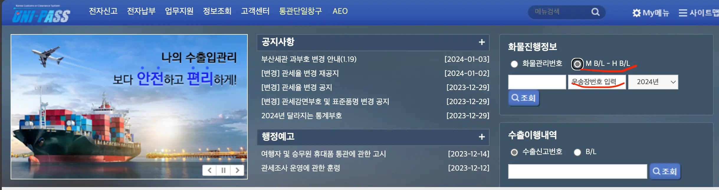 유니패스 사이트에 접속하면 메인화면 우측 상단에 '화물진행정보'를 조회할 수 있는 기능을 제공하고 있다. 알리에서 구입한 물건인 경우에는 'M B/L - H B/L'을 선택하고 '운송장번호 입력' 칸에 알리에서 복사한 글로벌 익스프레스 트래킹 번호를 입력하고 조회하면 된다.