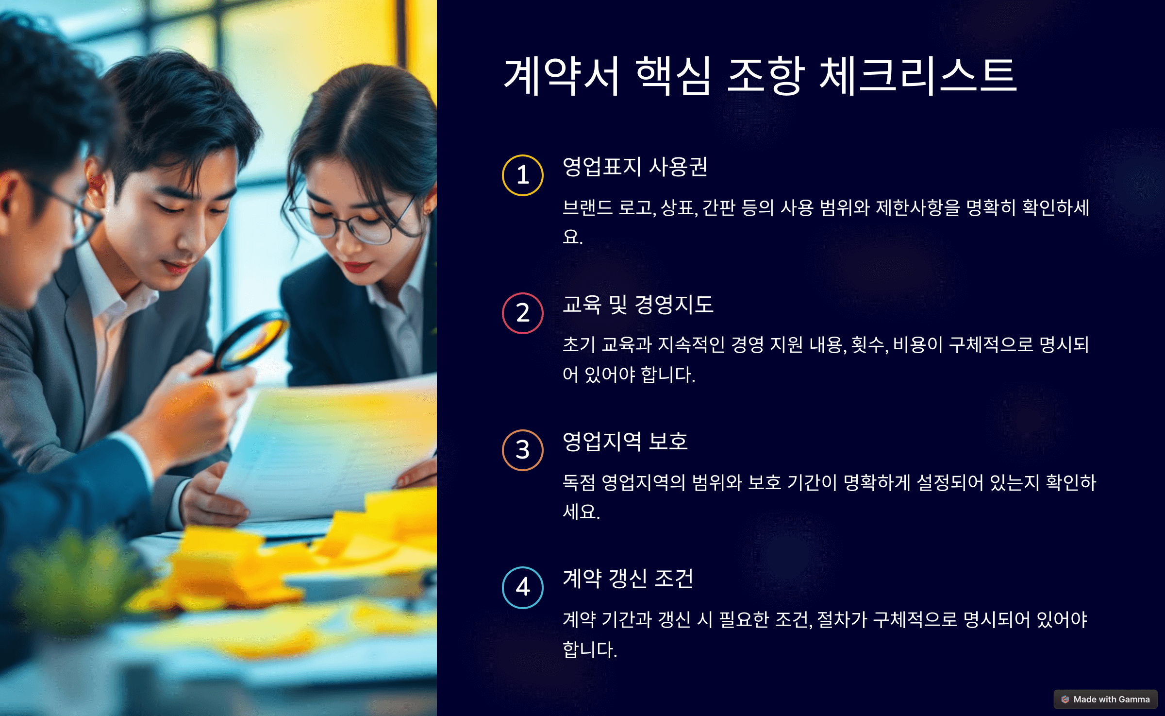 그럼 이제부터 프랜차이즈 계약서에서 반드시 확인해야 할 중요한 내용들을 하나씩 알아볼게요! 이 글에서는 실질적인 예시와 함께, 실제 가맹점주들이 겪은 경험담까지 담았어요. 나중에 ‘알았다면 피할 수 있었을’ 실수를 줄여보자구요!