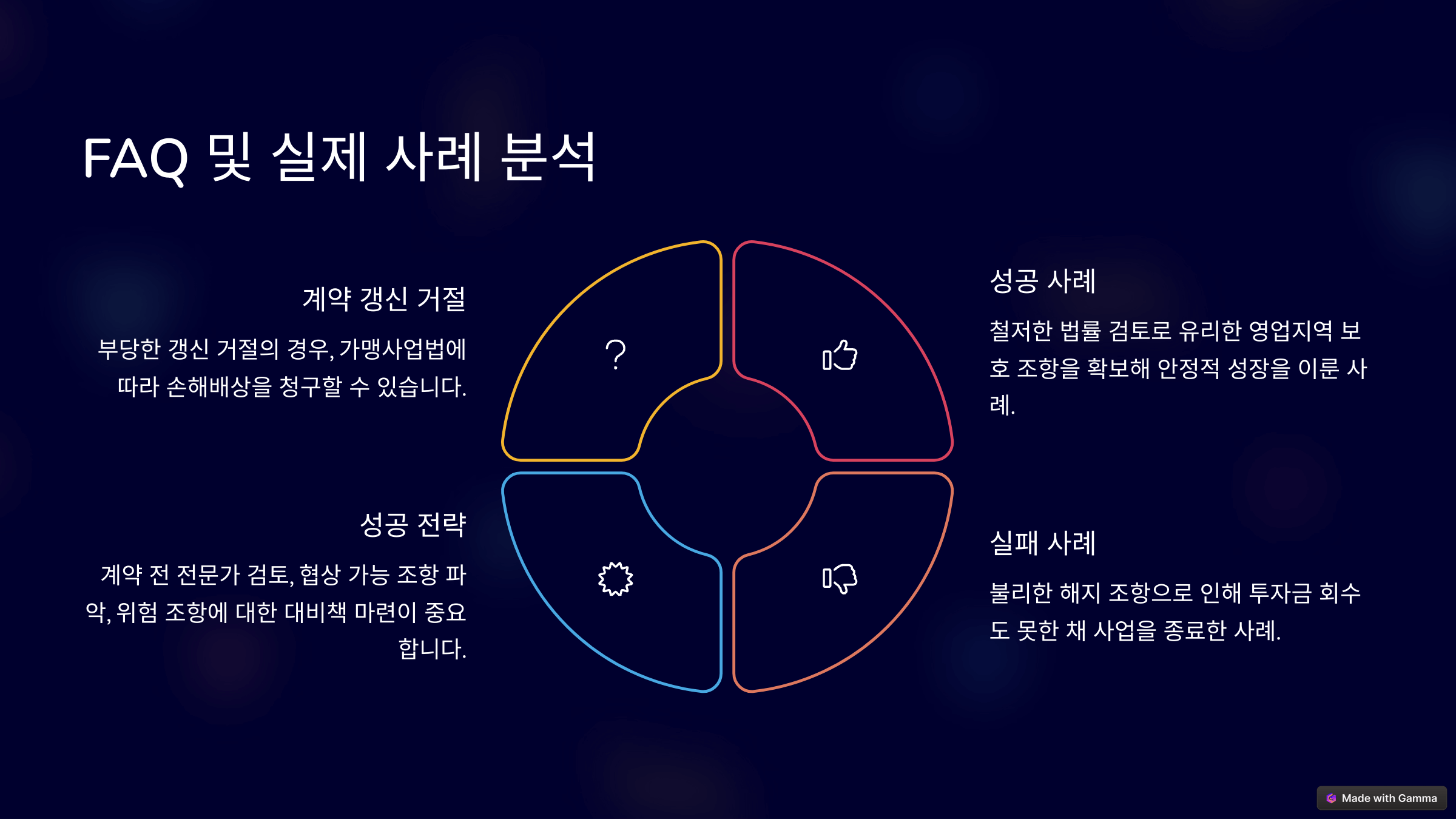 또한 프랜차이즈 계약은 ‘갑을 관계’처럼 느껴질 수 있지만, 사실상 둘 다 이익을 목표로 하는 사업자 간 계약이에요. 서로의 권리와 의무가 균형 있게 정리되어야 오랜 기간 동안 신뢰를 유지할 수 있답니다.