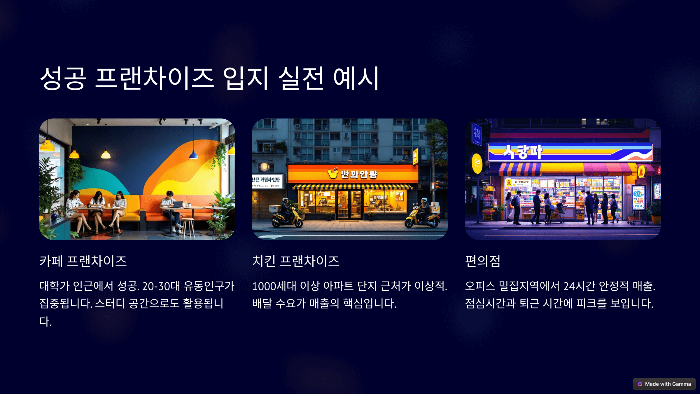 이제 이론은 충분히 익혔으니, 실제 성공한 프랜차이즈 매장들의 입지를 보면서 어떻게 상권과 입지가 맞아떨어졌는지 살펴볼 차례예요. 이런 실전 사례를 보면 ‘아, 이래서 이 자리가 잘 되는구나’ 하고 감이 확실히 와요!