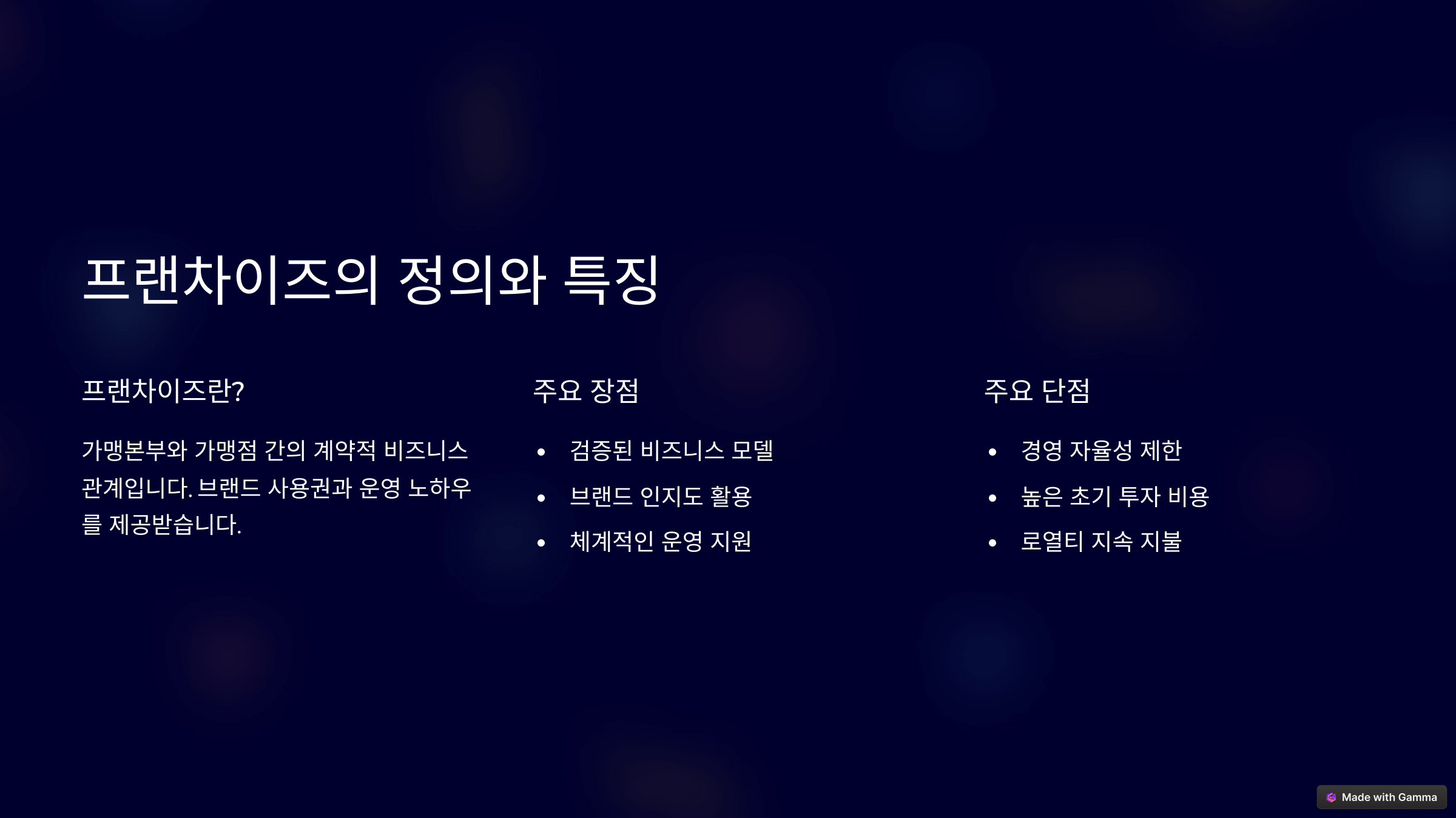| 프랜차이저(본사) | 브랜드, 노하우, 시스템 제공 |